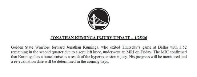 不曾想只打了2场就受伤了,今天勇士官方宣布,库明加确定为左膝过度伸展导致骨挫伤,具体缺战时间还不确定,需要等几天后复查。